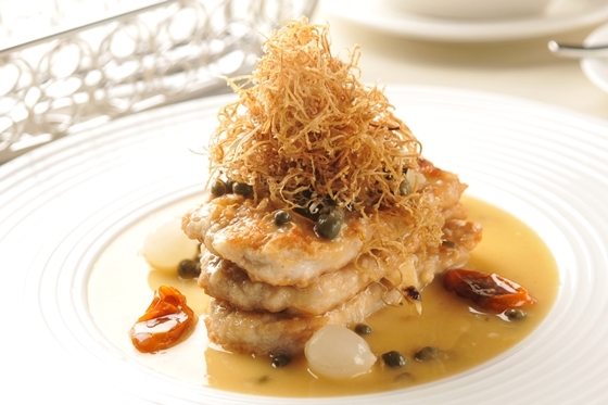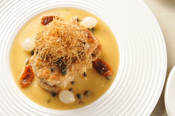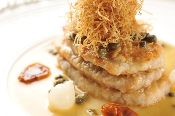 卡門貝乳酪香焗自然豬里肌佐鯷魚酸豆白酒醬汁
